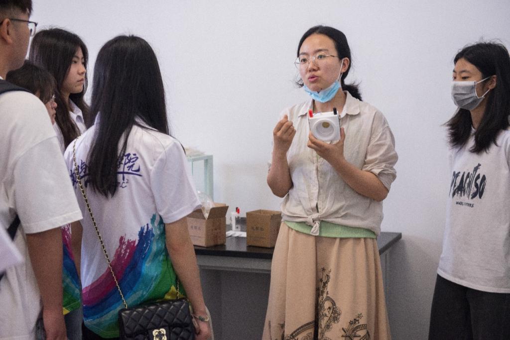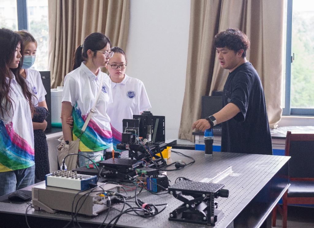 2022级光电信息工程研究生何亚龙向参观学生介绍实验功能情况