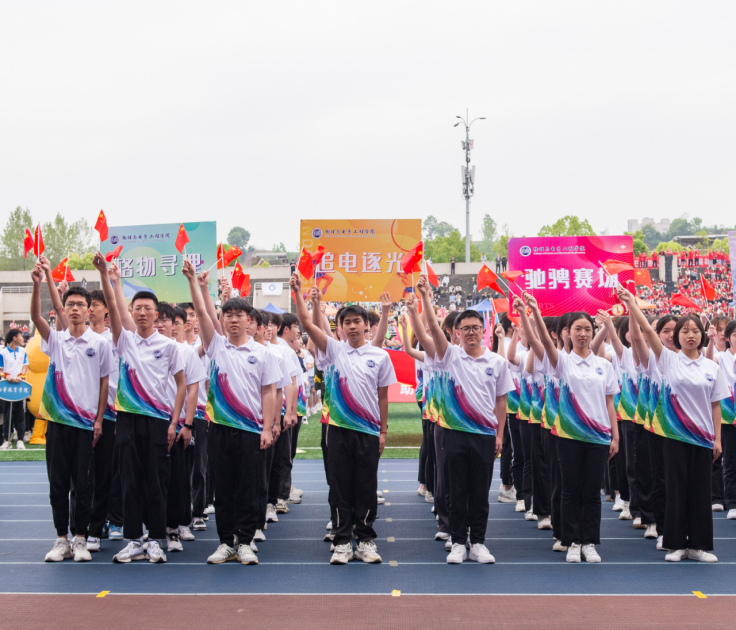 师生方阵迎着灿烂的朝阳在第16位出场。他们身着统一服装,神采飞扬,迈着坚定有力的步伐走向主席台。教职工手中的国旗迎风飘扬,学生高举手中的立牌,铿锵有力地喊出“格物寻理”“追电逐光”“驰骋赛场”“物电最强”!刹时,几架航模腾空而起,像几只雄鹰在运动场上空自由翱翔!运动场上的掌声、口号声、欢呼声与空中的航模飞机交相辉映,绘出一幅鼓舞人心的精彩画面!