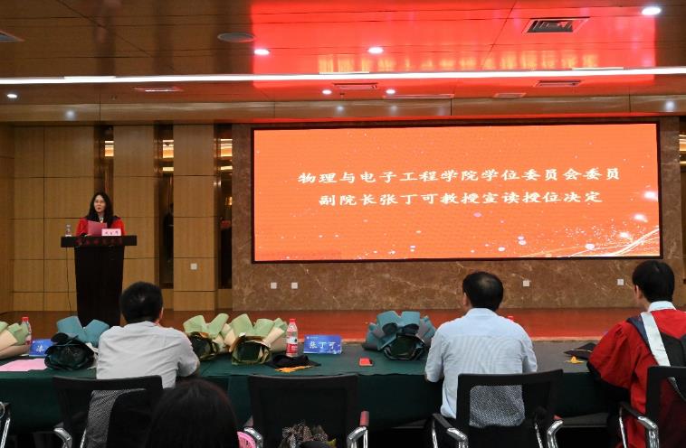 学位委员会副主席、副院长张丁可教授宣读授位名单;学位委员会余鹏教授、张丁可教授、杨晓红教授、龙兴明教授、牛连斌教授为毕业生拨穗授位。
