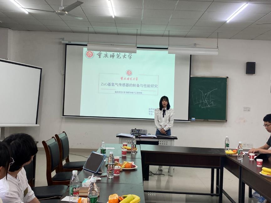龚庭韦,2020级凝聚态物理专业,师承杨晓红教授。主要从事信息材料物理与器件研究。2021年“基于摩擦纳米发电机的自供能室温NO2气体传感器”荣获2021中国传感器创新创业大赛(西南赛区)创新设计类别二等奖。该课题组主要从事信息物理与器件研究,在进行理论基础研究的同时,对ZnO,WO3等材料在微型气敏传感器、光致发光器件领域的应用也做了大量工作,已在国内外发表学术论文20余篇,被SCI、EI收录10多篇。在研讨会上,龚同学介绍了ZnO基氢气传感器的制备与气敏性能研究。