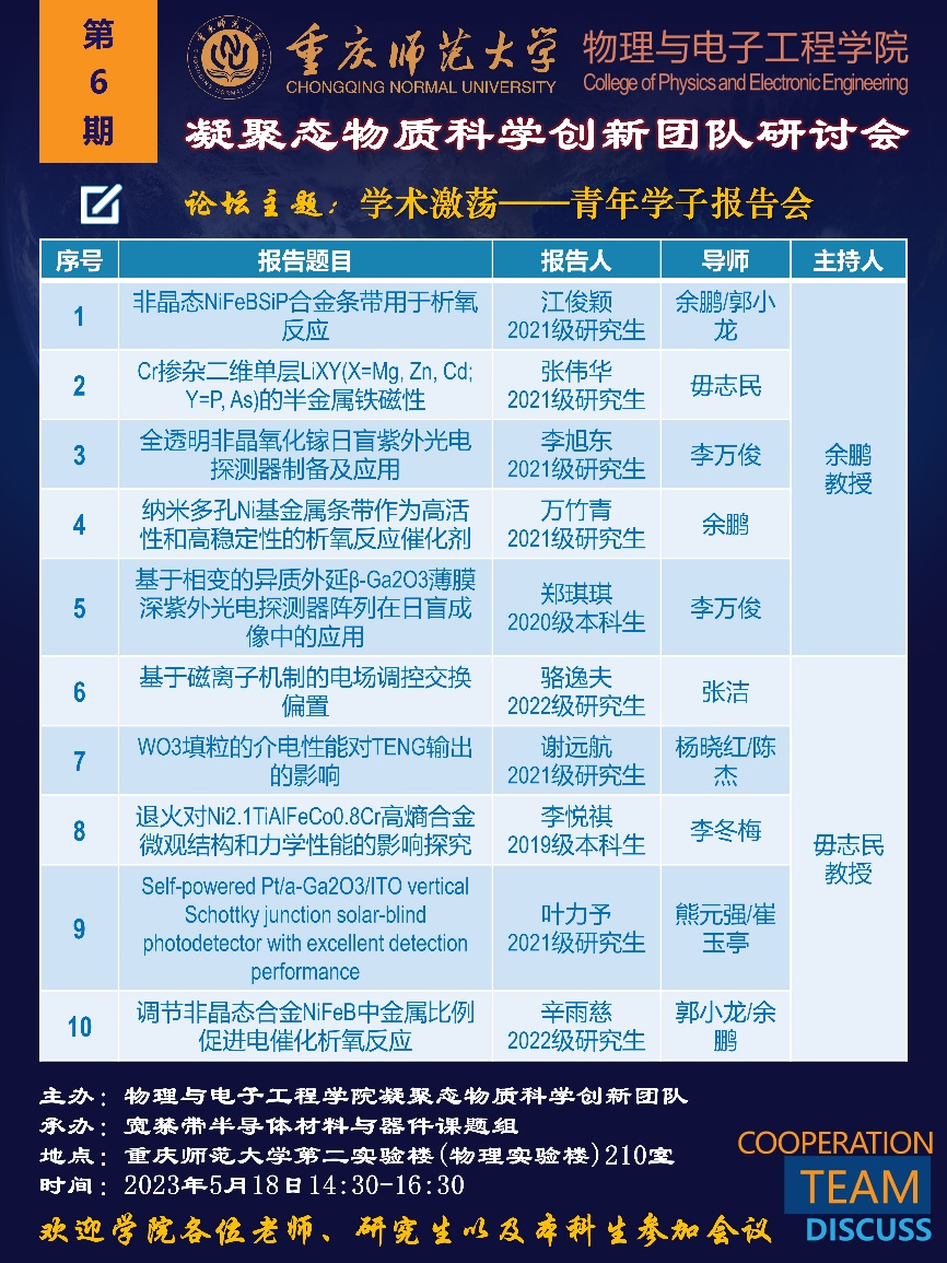 凝聚态物质科学创新团队的学术能力和活力,通过学术交流与研讨,拓展了青年学子学术视野,锻炼了学术总结和报告能力,提升了科研人才培养质量。