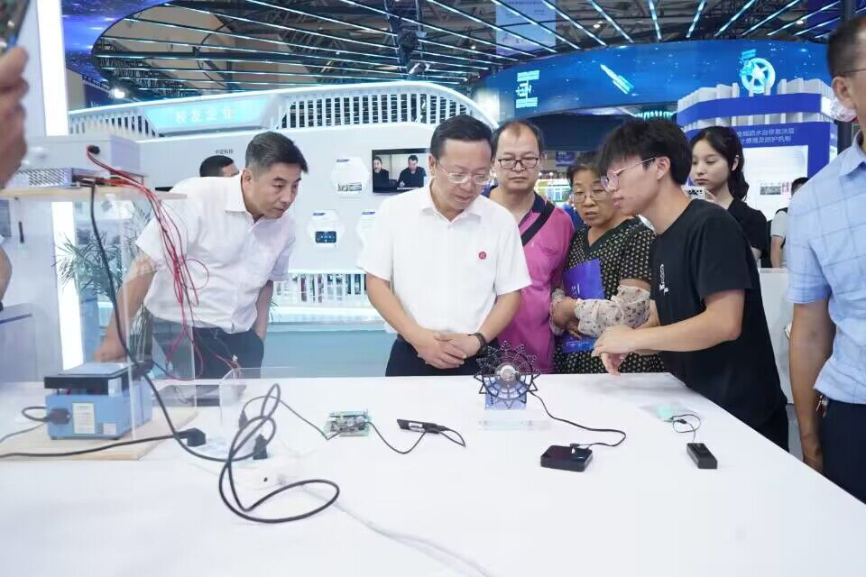 图为:孟小军副校长、付文升处长参观中国国际智能产业博览会有机半导体器件实验室展台
