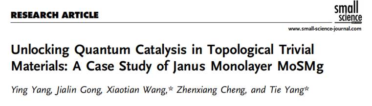 为第一单位在《Small Science》上发表题为“Unlocking Quantum Catalysis in Topological Trivial Materials: A Case Study of Janus Monolayer MoSMg”的最新研究成果。《Small Science》是WILEY在2021年最新推出的纳米领域开放获取顶尖旗舰期刊,最新影响因子为11.1。《Small Science》旨在成为大科学时代国际高质量的跨学科科研技术交流平台,致力于报道来自纳米科学和纳米技术各个领域最具影响力的研究成果。