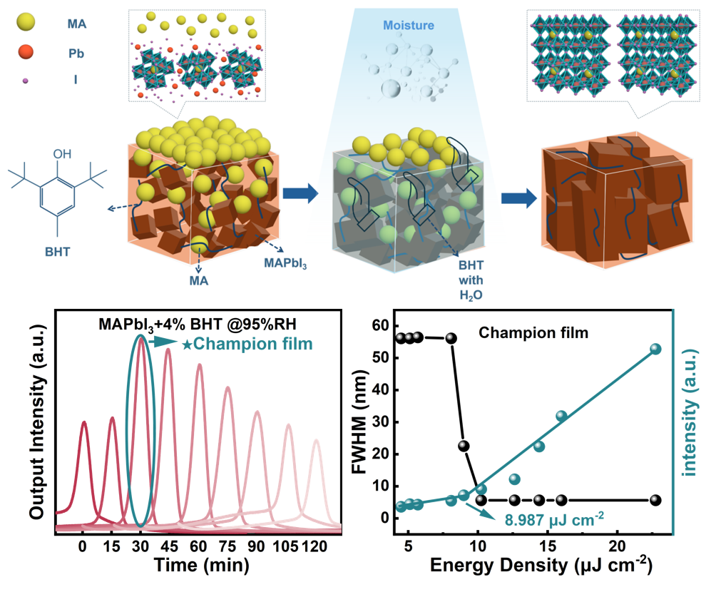 张丁可教授与东北师范大学付申成教授联合攻关,提出水分与二丁基羟基甲苯(BHT)协同调控策略,成功制备出低缺陷密度的甲脒铅碘(MAPbI₃)钙钛矿薄膜。该薄膜在纳秒脉冲激光激发下实现8.987 μJ cm⁻⟡的超低放大自发辐射(ASE)阈值,为当前同类研究最低值;同时在室温环境下存储30天后,ASE强度仍保持100%,实现效率与稳定性的双重突破。相关研究成果为钙钛矿激光的实用化提供了全新范式。未来,随着电泵浦技术的进一步突破,该类优质钙钛矿薄膜有望应用于片上集成激光器件、微型激光传感器、高清激光显示等领域,推动光子学技术向小型化、低功耗、高稳定性方向迈进。
