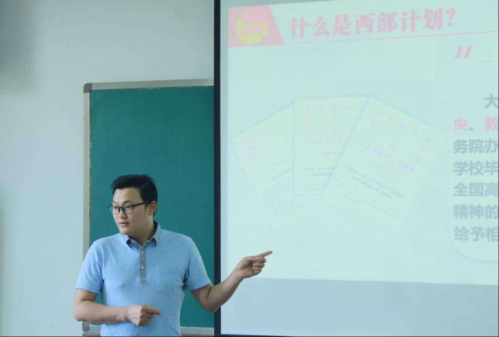 会议上,孙玖江老师根据同学们的切身需要介绍了西部计划的内涵、意义、参与方式以及志愿者培训、服务时间、享有待遇和奖励制度等。另外,他就西部计划考试面试进行了细致讲解,为同学们答疑解惑。最后,他强调了今年的报名时间截止到5月20日,在座同学可以分享此次会议内容给对西部计划不了解的同学,鼓励他们也踊跃参与到这个非常有意义的活动来。