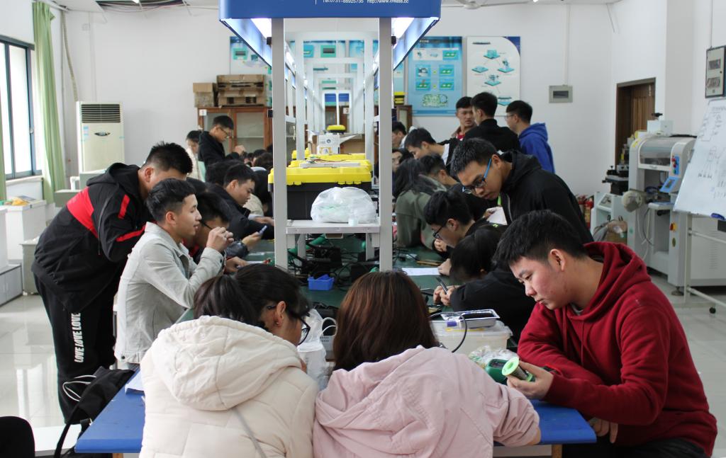 比赛过程中,协会人员对赛场秩序进行维持,并及时帮助参赛选手解决遇到的问题。同学们热火朝天地讨论,按照步骤有条不紊地进行焊接。在组员的相互配合下,各组参赛选手渐入佳境,逐渐找到了焊接的窍门,焊接速度逐渐加快。