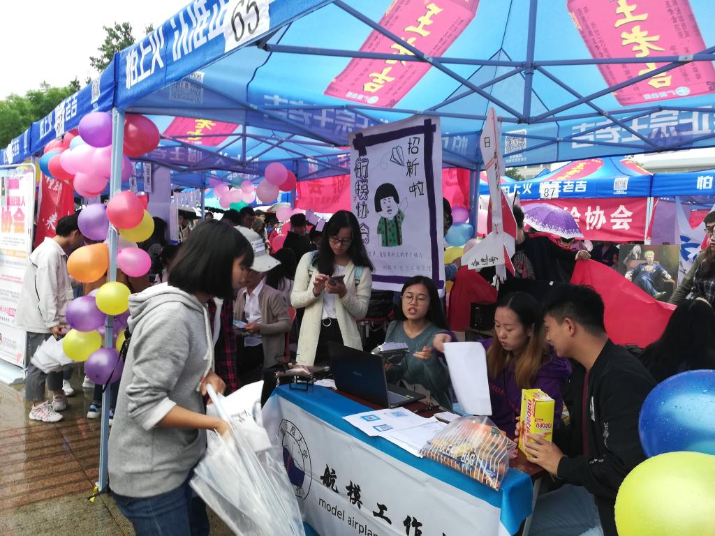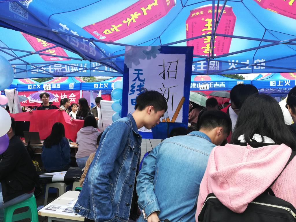 下午1点,天空中丝丝小雨变得淅淅沥沥,但它并没有熄灭各个社团的激情。陆陆续续搭起的小帐篷看似无序,却如蓝色花朵在三春湖畔绽出“2018”的字样。抬设备,装器材;试衣服,做造型;扎气球,摆零食,各个社团忙得热火朝天,更是给大一新生的心浓浓暖意。2点左右,大一新生们开始入场。欢乐的音乐声荡在三春湖里,漾在整个校园里,涌进每个同学的心里。各个社团都拿出了自己的看家本领:无线电协会摆出趣味高科技玩具,航模协会展示模型成果,创业协会提供小零食,师能素质协会全程安排能说会道的师姐,物理协会也摆出精妙的物理小实验 。热闹的场面立刻点燃了同学们的激情,人山人海里个个马不停蹄地寻找自己心仪的社团,不少已经加入社团的同学们也积极主动参加招新活动,极高的热情彰显了我们老虎机