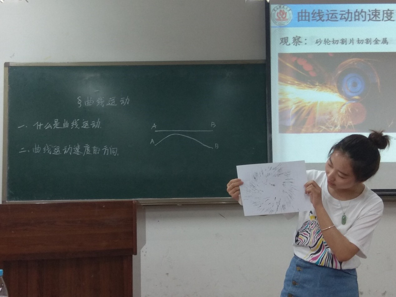 授课过程中,选手们合理掌握对于教具的制作和使用技巧,有意识地创设实验情境,激发学生的求知欲,拉近了物理实验和实际生活的距离。指尖陀螺、自我制作轨道的、插入实验短视频等教具的使用,进一步彰显了师范生实践应用能力和创新能力,彰显师范生特色。同时,选手们流畅的讲解,优美的板书,端庄大方、挥洒自如的仪态,也展现了过强的教学技能和教师风采。在比赛的最后阶段,教育学硕士杨英副教授对选手们进行点评总结,褒奖各异,指出问题所在,鼓励学生勤学善思并给予厚望。