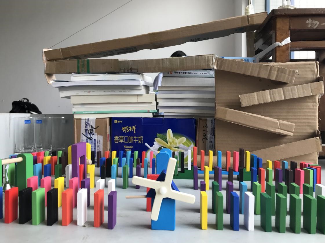 一触即发是联动装置的基本特点。为了达成这点,各组同学都格外地注意装置每个部分的连接细节。比如根据小球弹射角度设置下一组轨道;利用物体从高处滑下撞击小球等。同学们经历了无数次的失败、无数次的改进以及无数次的重新开始后,最终交出了令人满意的答卷。失败并不意味这结束,它只是告诉你还可以做得更好。大家都深知这一点,即便小球弹出轨道,即便没有做到完美,他们仍然坚持完成整个装置。