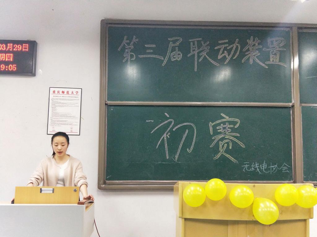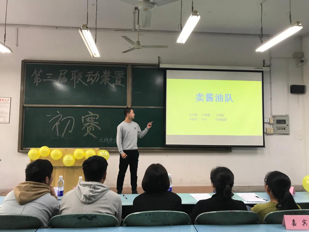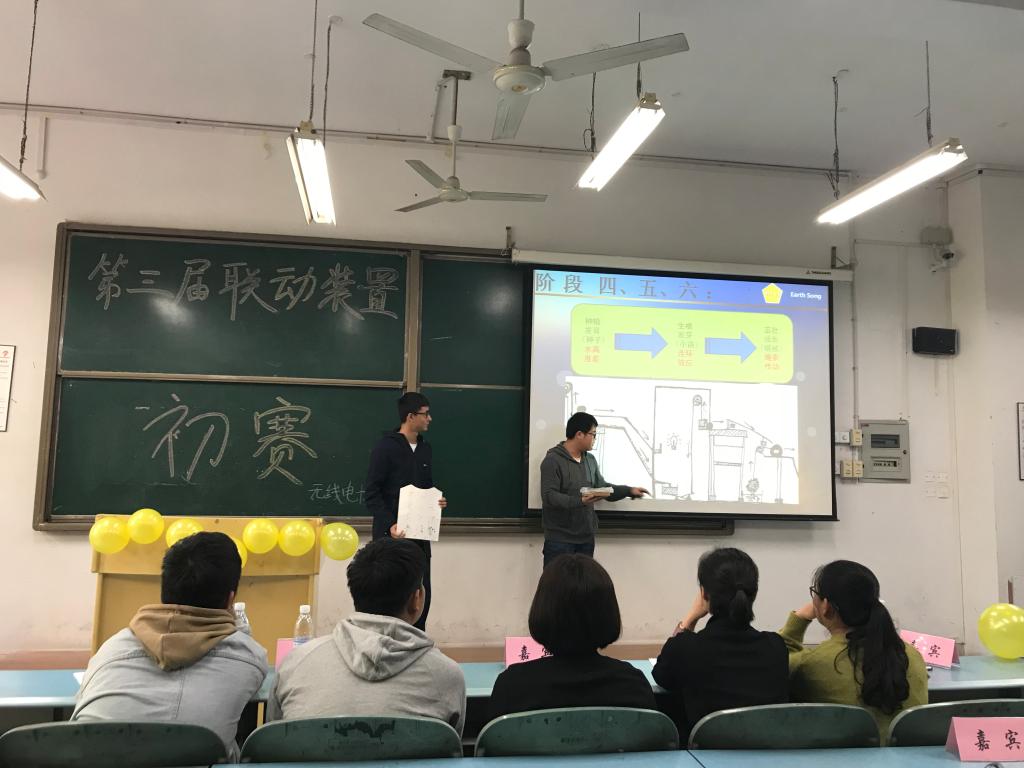 大赛的初次选拔方式为同学们上台放映各组的幻灯片,讲解联动装置的运行原理。无实物地讲解加大了难度同时也锻炼了同学们的演讲能力。初赛在主持人的介绍中拉开了序幕,同学们纷纷摩拳擦掌、反复练习,为上台演讲做着最后的准备。一场没有硝烟的战争就此展开。