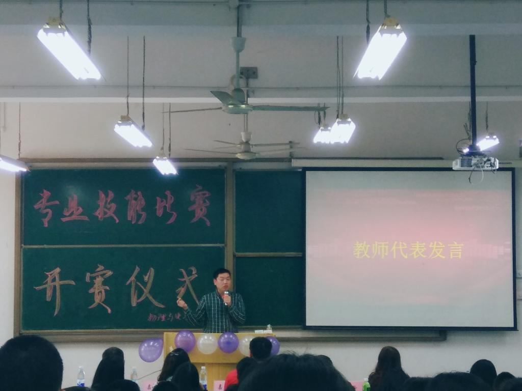 学生专业技能水平和动手实践能力,丰富比赛经验,为今后每位学子的就业打下良好基础,促使同学以最好的状态迎接大赛的到来,增强同学们的自信心,2017年11月3日下午一点,物理与电子工程院学生会科技部、学习部于弘德楼15104开展专业技能竞赛开赛仪式。邀请各专业老师为参赛同学现场指导,从而帮助同学们整理思路,积极备战。到场嘉宾有专业技能竞赛指导老师罗光老师、张丁可老师、范嗣强老师,团总支书记兼学工办主任李青松老师和全体辅导员,以及非师范生学生代表石林,师范生学生代表唐越。