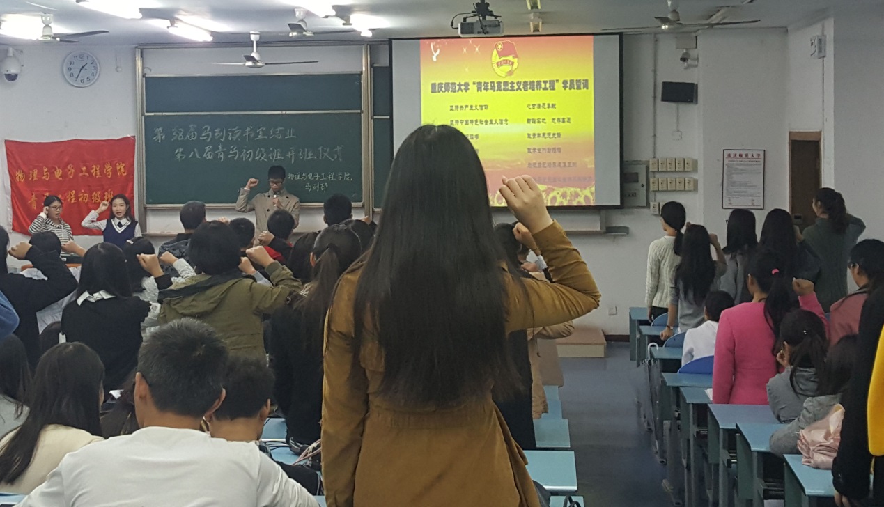 的图书馆楼下照相,当时围绕在他身边的就是‘青马工程’的同学。”李老师还告诫大家,在学习生活中,不管是讨论还是参加活动,都应该恪守一条底线——做一名有道德有修养,然后才是有知识有文化的优秀当代大学生。随后,由余海蔚老师宣读第三十八届马列读书室优秀成员名单,漆佳老师宣读第八届青马初级班成员名单。