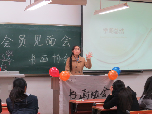本色。在大会的最后,书画协会副会长孟慧娇指出:“书画协会的存在活跃了校园文化,营造了人文社会,充分发挥了当代大学生的才华和精神风貌。”同时她也对上学期书画协会的工作做出总结,她说:“上学期的书画协会是充满力量的,我们开展了一个又一个活动来激发学生们的积极性。”并承诺,“我们将会更加积极的开展形式多样、健康向上的活动,培养学生高尚的道德情操,激发大学生学习热情也为广大同学在校期间能有提高书写绘画水平,锻炼自身能力机会,促进学生全面发展。”