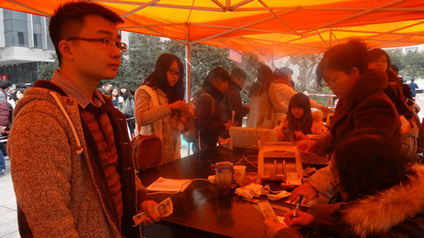 的报名咨询点处了解相关事宜。同学们也顶住寒冷为前来询问的学生耐心解释。