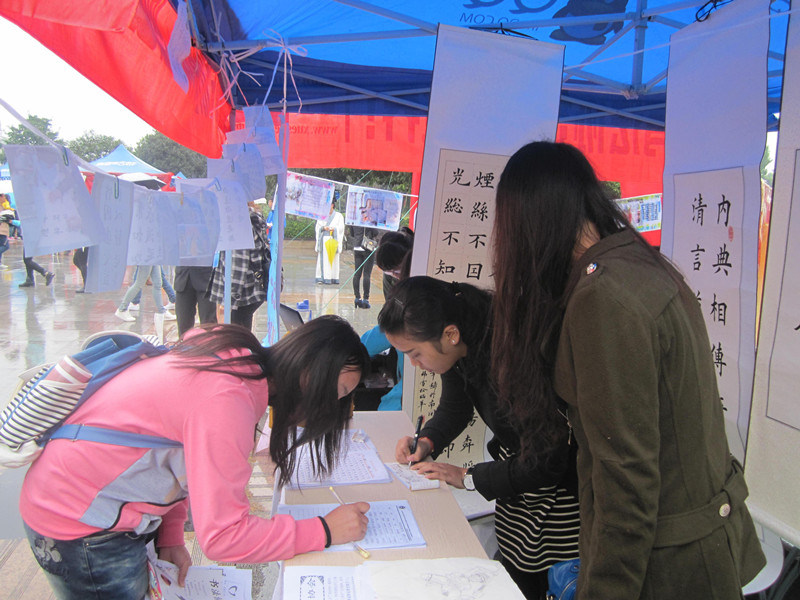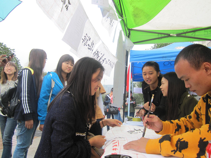 社团活动是每一个大学不可或缺的学生文化生活基石,近年来,随着经济文化的飞速发展,各种精彩纷呈的校园社团应运而生。它们的出现,丰富了大学生活,近代大学生的眼界得以开阔。2013年10月17日,书画协会会长吴筱带领各干事在图书馆前的中心广场举行会员招新活动。