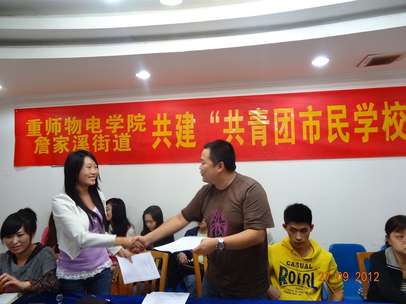团总支学生会代表匡珏环、吉婷婷等同学在沙坪坝区詹家溪街道与街道陈主任等主要领导干部顺利签约了关于双方共建“共青团市民老虎机