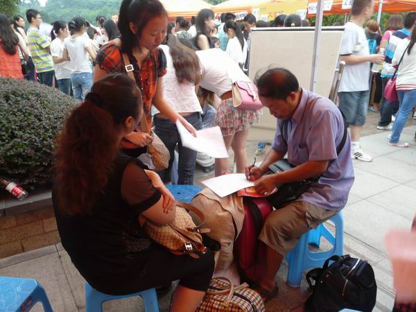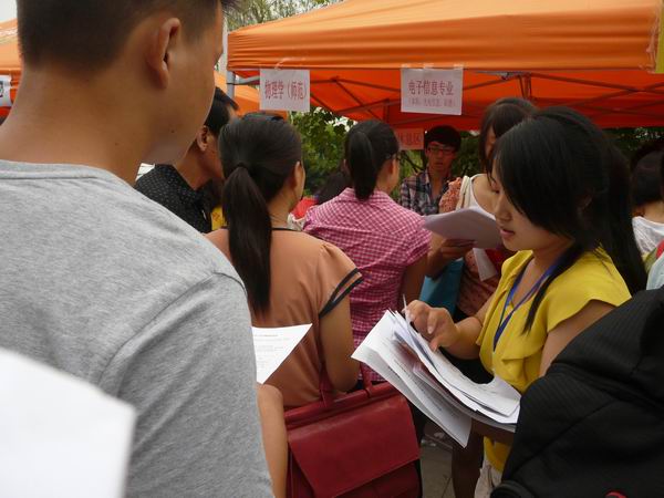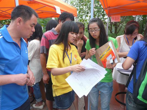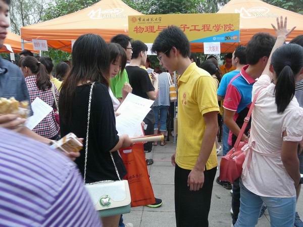 志愿者们也是早已等候在平台前,时刻准备着带着学弟学妹们开始迎新流程之旅。学长学姐们有的在耐心地为新生们解决不懂的问题,有的在和新生家长攀谈,有的为家长送上一杯水,有的帮助学弟学妹们拿行李,还有的带着新生走报道流程......都在做自己力作能及的事情。也有9月7号已经完成报道流程的2012级新生,自愿作为志愿者接待8号来报道的新生,奉献出了自己的一份力量。