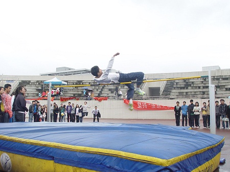 在100米的跑道上,有种精神在奔跑,有种力量在冲刺,有种活力在四射。同样的,在跳高项目中,运动员们如海上的浪花,似浪花上的云燕,灵巧的速跑,轻轻的一跃,落下的是小小的横竿,升起的是不屈的信念,那是他们勇于向高峰征服的精神……