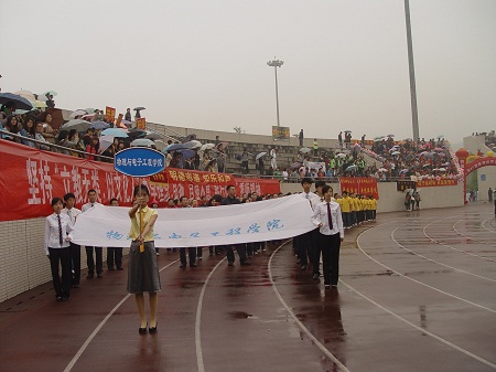 的方队,他们迈着矫健的步伐走在呼声一片的操场上,有理由相信他们在接下来的正式比赛中能够创佳绩。这次的开幕式中虽有小雨,但是所有人都激情澎湃,雨浇不灭!