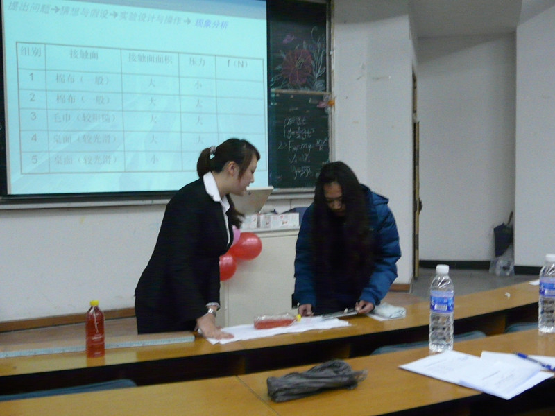 选手用饮料,毛巾,木板,泥鳅,凳子等实验器材生动形象的为大家讲解了“探究影响摩擦力大小的因素”这一课题。此外,活动的高潮当属主持人带领各位评委及同学们进行了“击鼓传花”和“脑筋急转弯