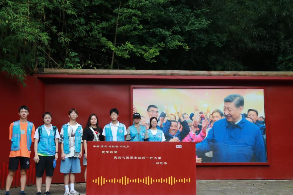 图为志愿者团队观看中益乡发展变化。 彭靖杰 摄