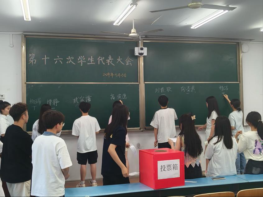 学生代表们根据候选人的现场表现,慎重地填写选票。在监票人的组织下,他们依次上台,将手中的选票投入票箱,整个投票过程规范有序。