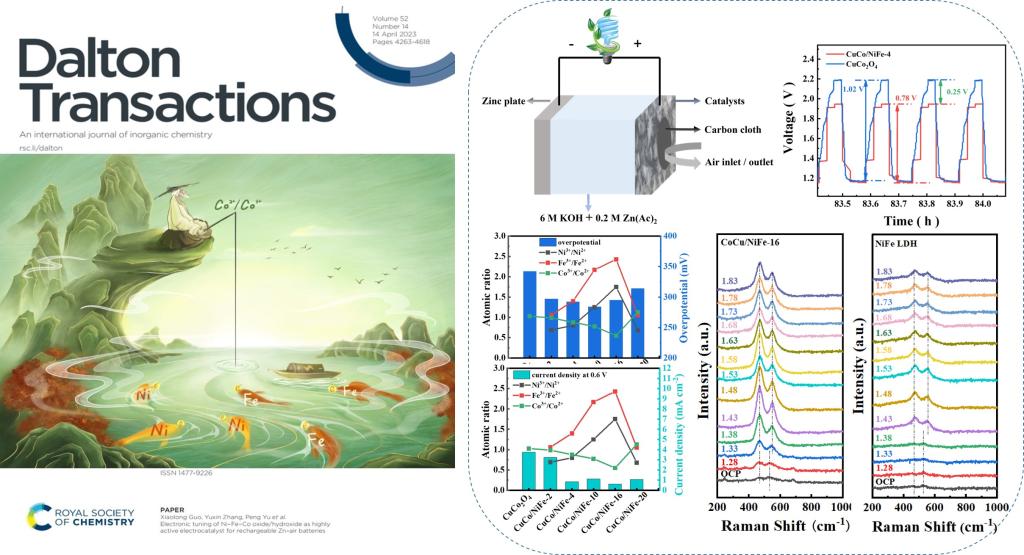 为第一单位在《Dalton Transactions》(JCR一区)上发表封面文章(Front Cover),题目为“Electronic tuning of Ni–Fe–Co oxide/hydroxide as highly active electrocatalyst for rechargeable Zn–air batteries”。