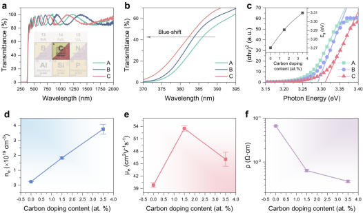 氧化锌(ZnO),凭借其卓越的性能、环境友好及成本效益等,已成为透明导电氧化物领域的优选材料之一。本研究聚焦于掺碳技术,旨在探索其在提升ZnO薄膜光电性能方面的潜力。实验结果显示,碳掺杂ZnO(ZnO:C)薄膜在保持高质量表面形态的同时,其在可见光范围内还具有超高透过率,光学带隙表现出典型的Burstein–Moss效应。进一步分析表明,随着碳掺杂量的优化,ZnO:C薄膜展现出了高载流子浓度(~3.73×1019 cm-3)、低电阻率(~3.69×10-3 Ω·cm)以及保持高迁移率(~46.08 cm2/V·s)。基于此,团队将新型ZnO:C透明导电薄膜应用于Ga2O3基日盲深紫外光电探测器中,作为透明电极材料,成功实现了透明光电探测器件的构造,并表现出卓越的日盲深紫外光电探测能力。这一成果不仅为透明导电材料的研发开辟了新的路径,ZnO:C也有望成为传统IIIA掺杂ZnO透明导电材料在光电器件领域的有力竞争对手,展现出广阔的应用前景。