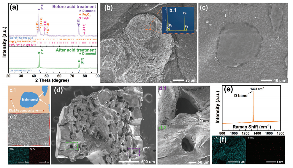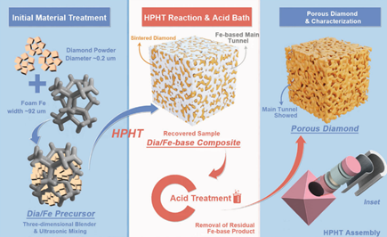 受Fe-Ni催化剂在高温高压(HPHT)条件下展现的共晶特性与泡沫玻璃碳转化为金刚石的启发,李帅錡博士提出一个能够更高效合成多孔金刚石的猜想:在高于共晶温度的金刚石烧结过程中,巧妙运用可溶性骨架作为媒介,并借助化学处理的手段可能获得多孔金刚石结构。因此,该研究结果提出了一种新颖、高效且成本低廉的制造多孔金刚石而不损伤表面的方法,并利用此种可溶性骨架的高温高压法(HPHT-ss)在7 GPa(7万个大气压)、1400℃下合成了毫米级多孔金刚石。相关表征显示,该多孔金刚石在维持高硬度(~70 GPa)的同时,具有39.13 m2g-1的比表面积。并且在微米量级(平均75微米)和纳米量级(平均55纳米)上分布着介观尺度的孔结构,这使得它与其他方法合成的金刚石相比具有独特的介孔特性。
