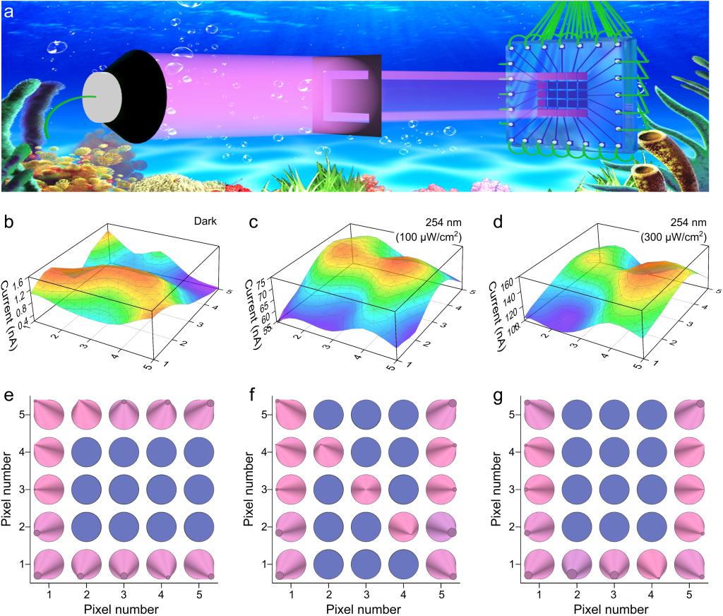 宽禁带半导体材料与器件团队通过平衡载流子动力学,实现了高性能Ga2O3基自供电日盲紫外光电探测器阵列,并探索了其在水下成像中的应用潜力。相关研究成果以老虎机