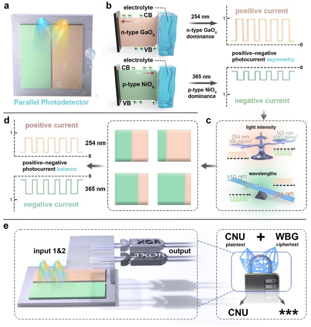 双极性光探测器凭借其正负光电流响应特性及耦合赋能的多功能性,在逻辑门加密光通信领域展现出巨大潜力——该领域需精确平衡光电流以最小化极性诱导逻辑误差并确保传输精度。本文开发出基于全非晶p-NiOX与n-GaOX 薄膜的并行结构自供电光电化学探测器,展现出双波段(254 nm/365 nm)双极性光响应特性。为解决固有光电流不对称问题,首先采用热退火工艺缓解失衡现象。更重要的是,依托独特的并行架构,该团队提出一种通用几何工程策略:仅需调整两种光活性材料的面积比,即可精确平衡正负光电流。该方法能在多种波长组合下实现强健的光电流对称性,确保对复杂光学环境的广泛适应性。基于此可调特性,演示了可重构的二进制与三进制异或(XOR 和 TXOR)逻辑门,将其作为光通信系统的加密框架。三值光电逻辑门加密方案相较二值系统提升信息吞吐量约1.585倍,密钥空间扩展达89 %。本研究提出实现平衡双极光探测器的通用策略,为安全高效的水下光通信应用奠定基础。