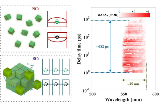 针对上述问题,研究团队与合作者通过疏水自组装策略,构建了长程有序的“超晶体”。该工作的核心创新在于利用超晶体中紧密排列的纳米晶结构,激发了“协同激子”效应,成功绕过了单个纳米晶的光学增益物理限制。瞬态吸收光谱实验表明,超晶体展现出极小的双激子结合能(约4.6 meV,远低于孤立纳米晶的14.7 meV),并有效抑制了俄歇淬灭。这种协同量子现象使得激子表现出明显的离域特性,将光学增益寿命延长至约0.68纳秒。基于此,研究团队实现了超过1000 cm-1的增益系数,并在纳秒光泵浦下,以超低阈值实现了随机相干激光出光。