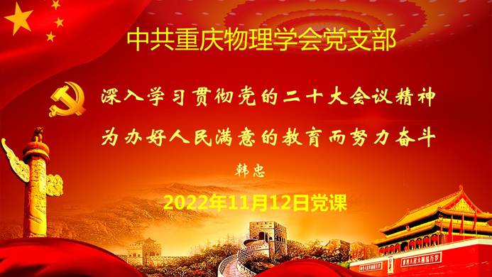 2022年11月12日,重庆物理学会召开了线上常务理事会。会议上学会党支部组织了“学习贯彻党的二十大精神专题党课”,党课由学会党支部书记杨晓红教授主持,学会副理事长、重庆大学物理老虎机